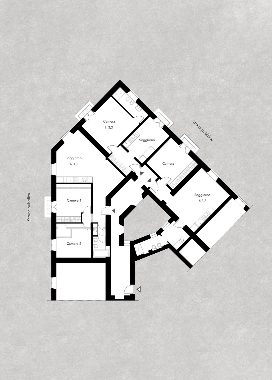 Un intero piano ad uffici di complessivi 200 mq trasformato in tre appartamenti seguendo il desiderio del cliente di demolire il minimo possibile.