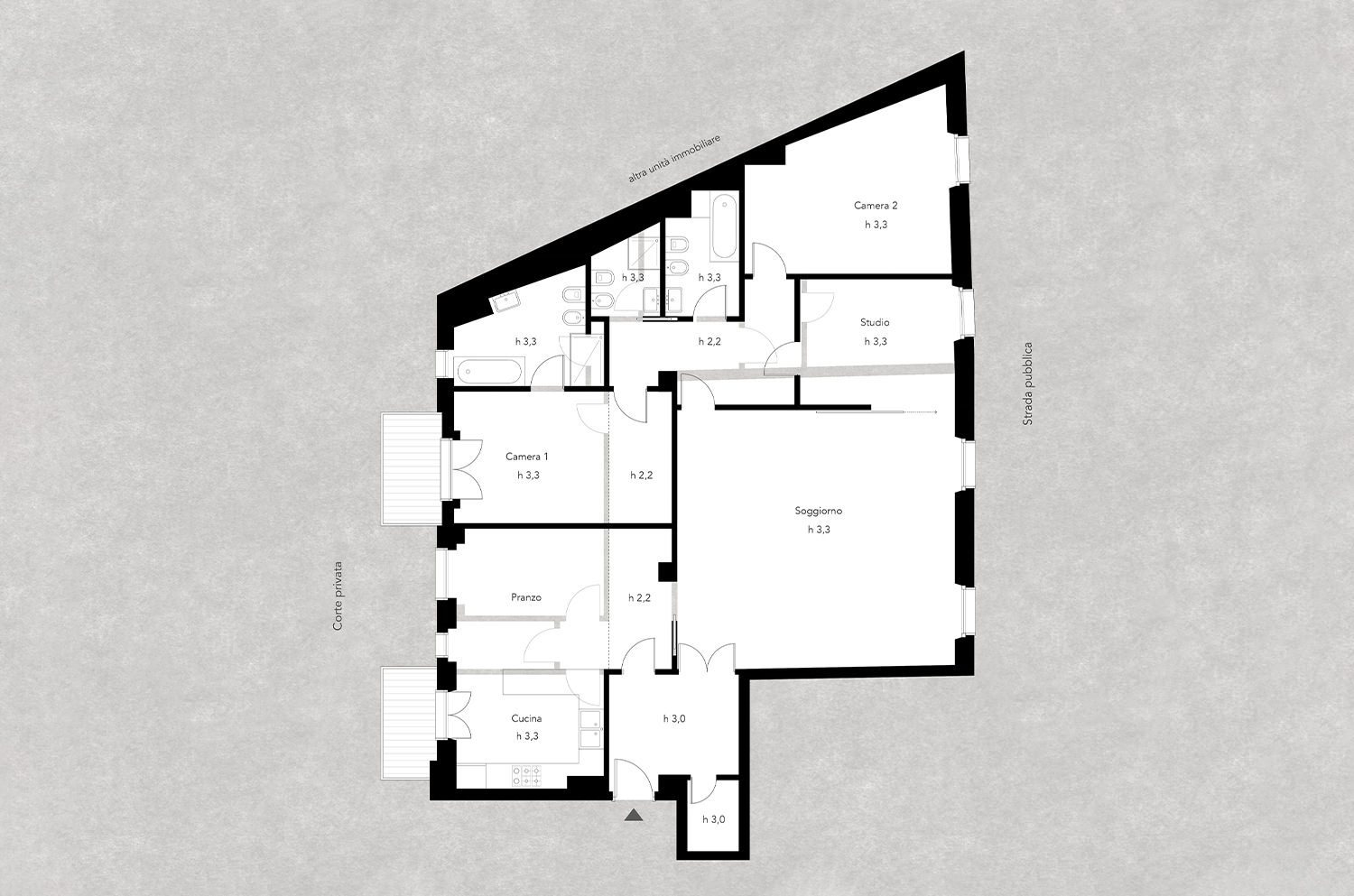Appartamento di 200 mq adibito a ufficio trasformato in residenza. I desideri del cliente comprendevano una grande cucina con zona pranzo, un ampio soggiorno, due camere e tre bagni. Sono stati conservati e restaurati i serramenti esterni in legno.