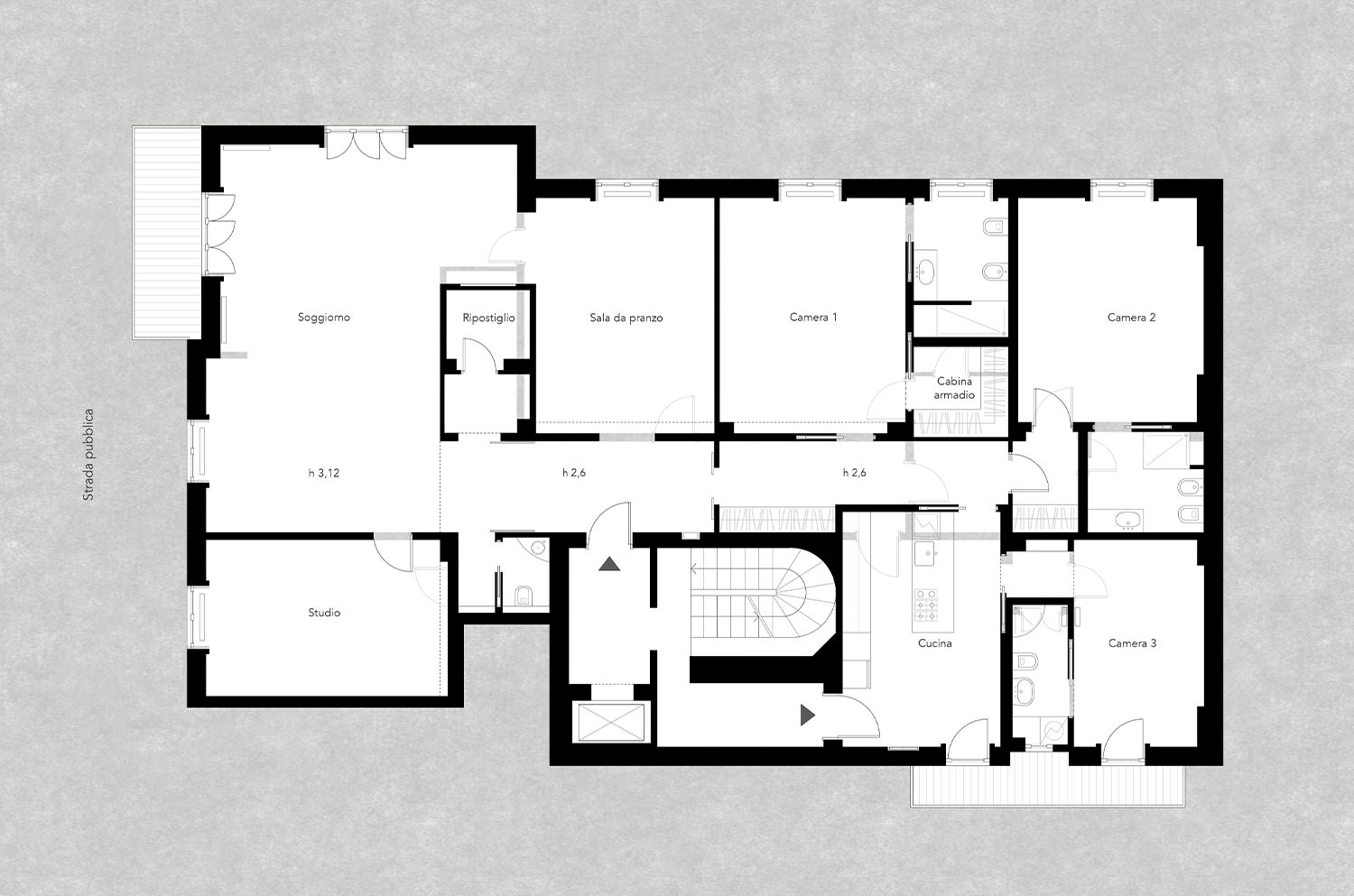 Appartamento di mq 240. La proprietà desiderava due camere padronali, un’ampia zona soggiorno con sala da pranzo separata, un piccolo bagno di cortesia e una zona di servizio con ampia cucina. Si sono mantenuti gli imbotti in legno e il pavimento in breccia nell’ampio corridoio di distribuzione, conservando così il carattere anni ’40 dell’appartamento.